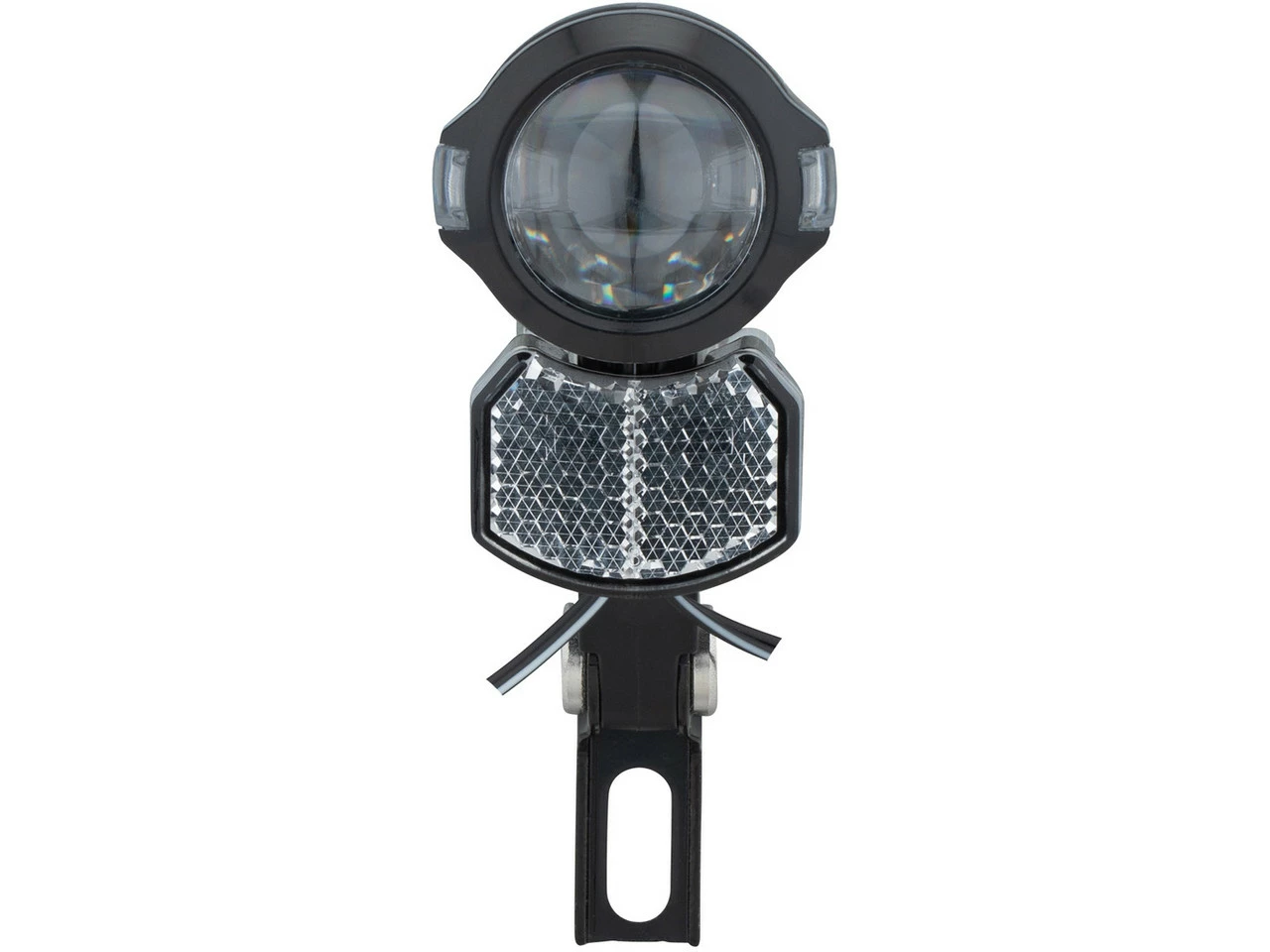 Spezifikationen:Ausführung:Frontlicht (weiß)Montage:Befestigung an der GabelkroneLeuchtmittel:1x LEDLeuchtkraft:35 LuxBetriebsmittel:NabendynamoTechnische Daten:Material:KunststoffStandlicht:Ja (4 min.)Schalter:Ein / Aus / Automatik (Sensor)Freigaben:Zulassung im Straßenverkehr:Ja, für Fahrräder nach §67 StVZOPrüfziffer:K~~1583Features:mit integriertem Frontrückstrahlergute Lichtverteilung dank Doppel-Linsen-Optikseitliche Sichtbarkeit durch zusätzliche FensterHerstellernummer:93944295SB