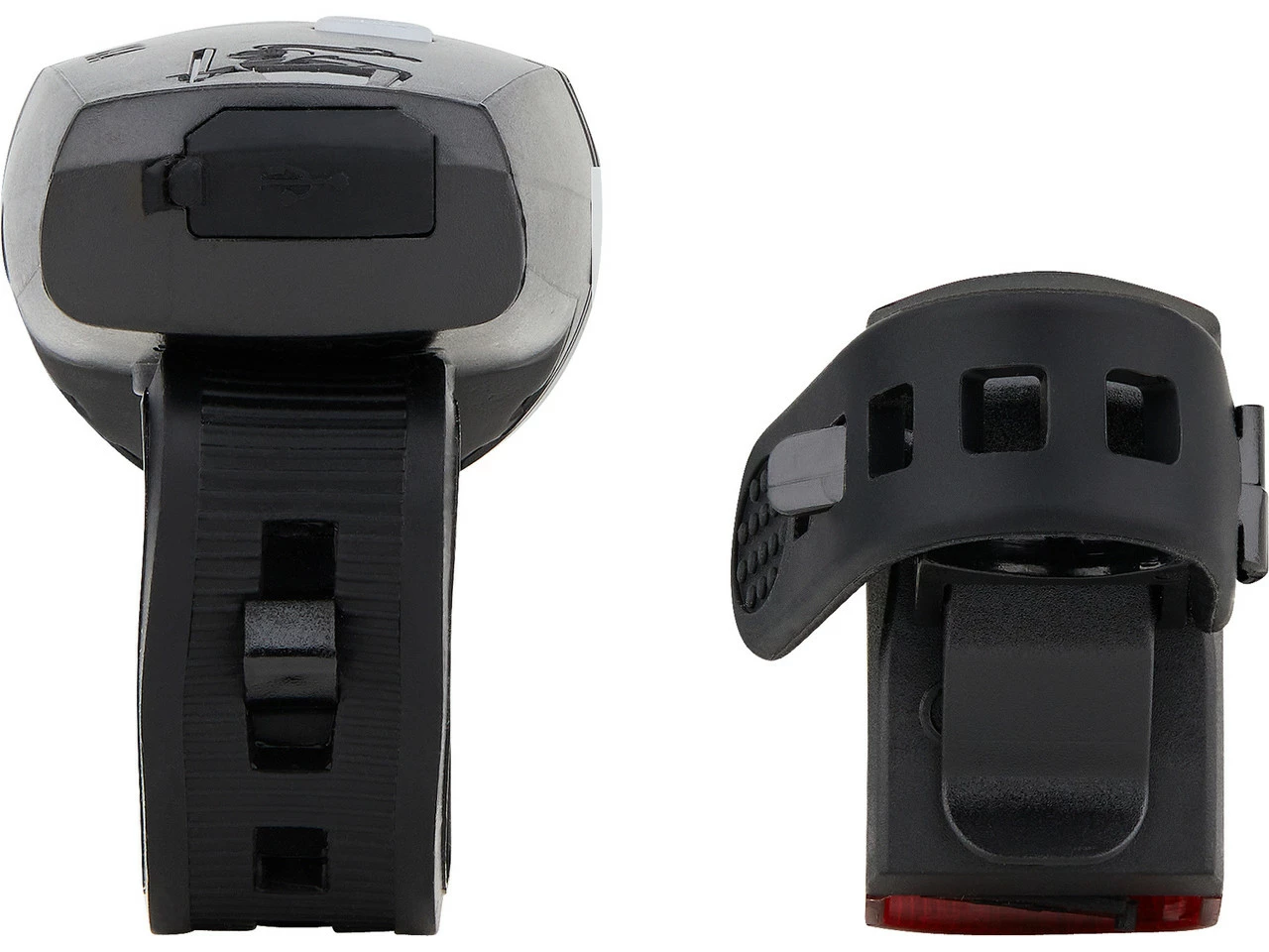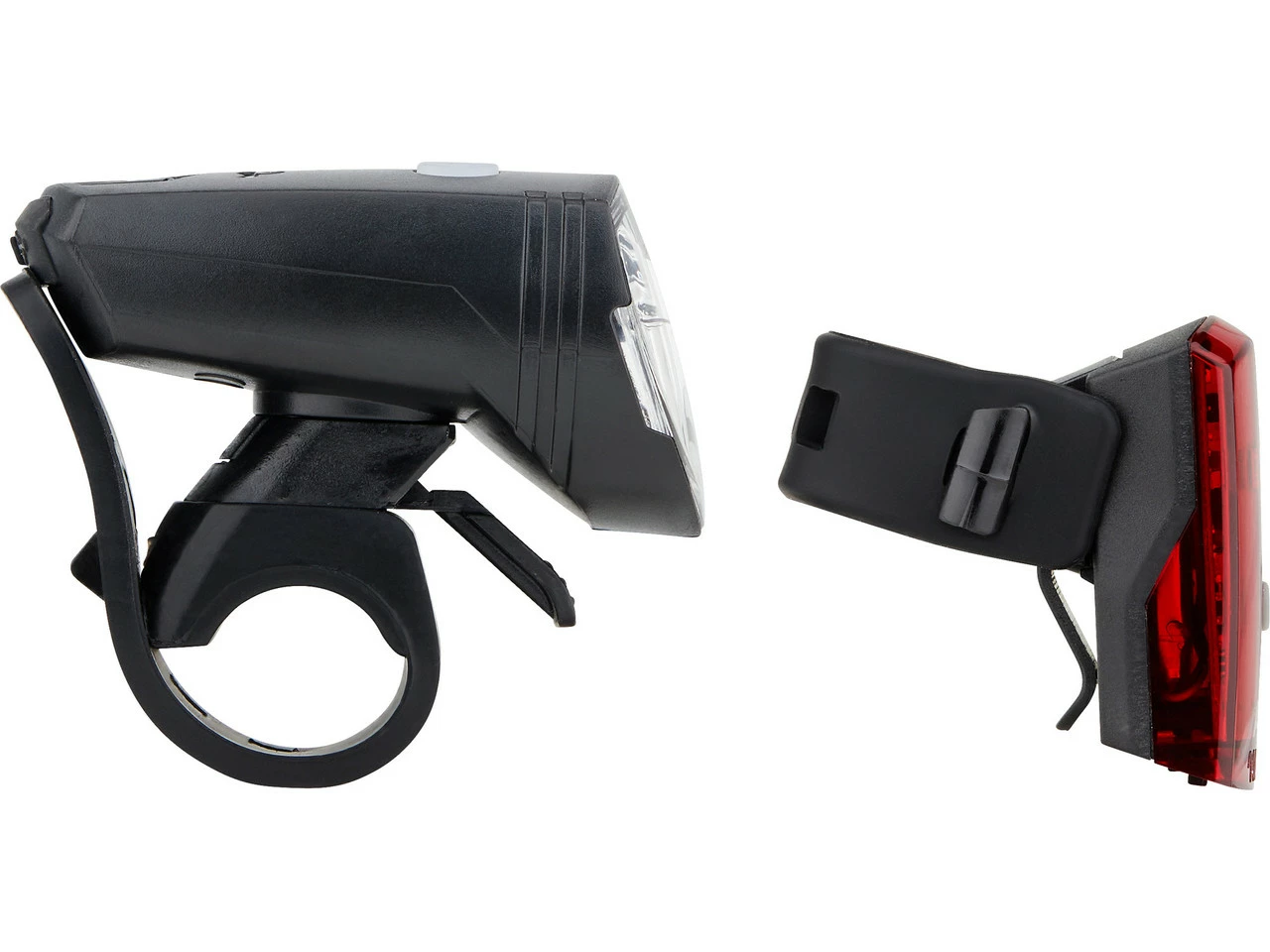 Spezifikationen Frontlicht:Ausführung:Frontlicht (weiß)Montage:LenkerLeuchtmittel:LED (1)Leuchtkraft:15 LuxLeuchtdauer:6 StundenLeuchtweite:35 mBetriebsmittel:Akku (Li-Ion), integriertTechnische Daten Frontlicht:Leuchtmodi:1 ModusLadestandsanzeige:Ja (Batterie schwach)Ladezeit:2 StundenMaße (H x B x L):65 x 40 x 50 mmMaterial:KunststoffSchalter:Ein / AusFreigaben Frontlicht:Zulassung im Straßenverkehr:Ja, für Fahrräder nach §67 StVZOPrüfziffer:K~~1079Spezifikationen Rücklicht:Ausführung:Rücklicht (rot)Montage:Sattelstütze, HinterbaustrebenLeuchtmittel:LED (1)Leuchtdauer:4 StundenLeuchtmodi:1 ModusBetriebsmittel:Akku (Li-Ion), integriertTechnische Daten Rücklicht:Leuchtmodi:1 ModusLadestandsanzeige:Ja (Batterie schwach)Ladezeit:1,5 hMaße (H x B x T):45 x 30 x 30 mmMaterial:KunststoffSchalter:Ein / AusFreigaben Rücklicht:Zulassung im Straßenverkehr:Ja, für Fahrräder nach §67 StVZOPrüfziffer:K~~1100Kompatibilität:Frontlicht: