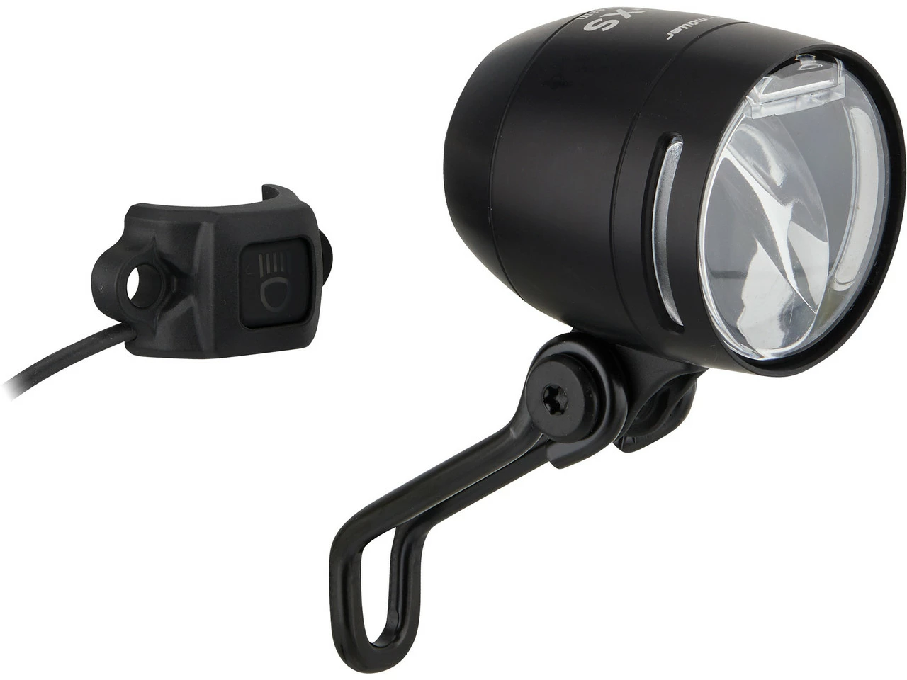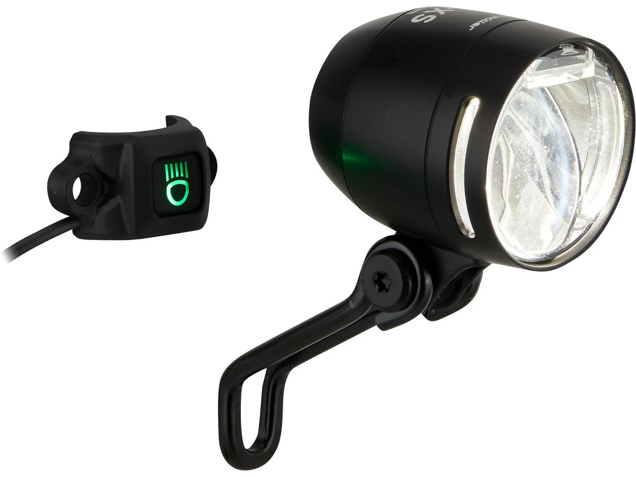 Spezifikationen:Ausführung:Frontlicht (weiß)Montage:GabelkroneLeuchtmittel:LED (4)Leuchtkraft:150 Lux (Fernlicht), 100 Lux (Abblendlicht)Betriebsmittel:E-Bike-AkkuTechnische Daten:Leuchtmodi:Abblendlicht, Fernlicht, LichthupeSpannung:9 – 48 VMaterial:AluminiumSchalter:Ein / Aus / Fernlicht / LichthupeFreigaben:Zulassung im Straßenverkehr:Ja, für Fahrräder (nach §67 StVZO)Prüfziffer:K~~1800Features:kompaktes E-Bike-Frontlicht aus Aluminium mit 150 Lux starkem Fernlicht zur Festmontage an der Gabelkrone100 Lux Beleuchtungsstärke im Abblendmodusgleichmäßig ausgeleuchtetes, weites Lichtfeldseitliche Lichtöffnungen am Gehäuse für mehr Sichtbarkeitfarbig leuchtender Lenkertaster zum Wechsel zwischen Abblendlicht, Fernlicht und LichthupeTaster-Befestigungsschelle für Lenker mit 22 mm Durchmesser oder zur Direktmontage an Bremshebeln von Magura und Tektrooptional am Lampengehäuse montierbarer FrontreflektorAkku-Nennleistung: Fernlicht 11 W, Abblendlicht 7 WTechnologie:IQ-Technik