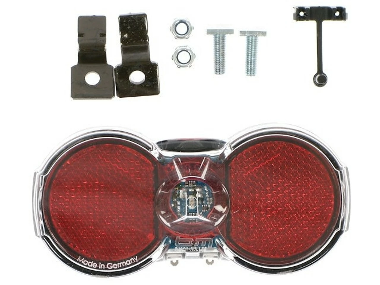 Spezifikationen:Ausführung:Rücklicht (rot)Montage:Gepäckträger, Schraubenabstand 50 – 80 mmLeuchtmittel:1 x LEDBetriebsmittel:Nabendynamo, SeitenläuferdynamoTechnische Daten:Material:KunststoffStandlicht:Ja (nicht abschaltbar)Freigaben:Zulassung im Straßenverkehr:Ja, für Fahrräder (nach §67 StVZO)Prüfziffer:K ~~708Features:extrem leicht und flach (20mm)220° Sichtbarkeit durch patentiertes Linsensystemelegant in zwei Kreisflächen integrierter Z-Rückstrahlereinfache Gepäckträgermontage bei 50 oder 80 mm Bolzenabstandpraktische Standlichtfunktion über Kondensatorje ein Steckkontakt für Strom und Massekabelzugelassen im Bereich der StVOTechnologie:Standlicht