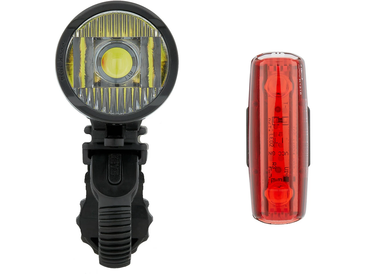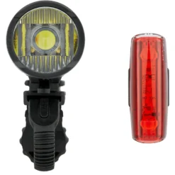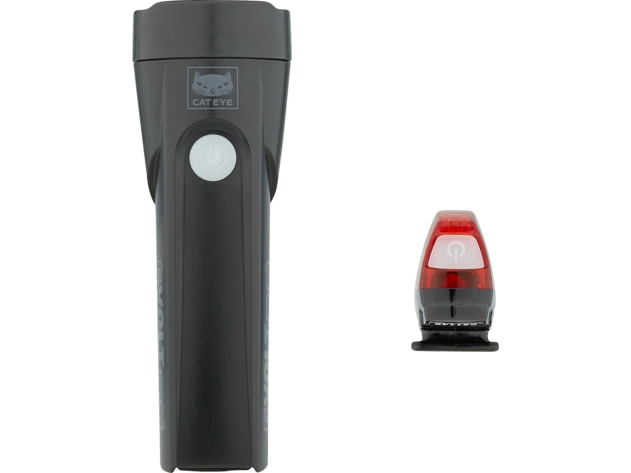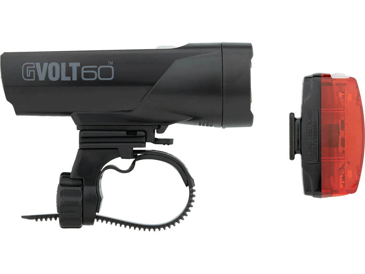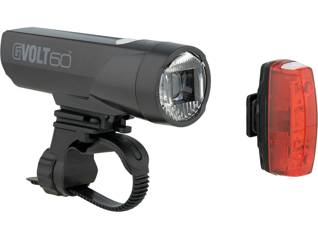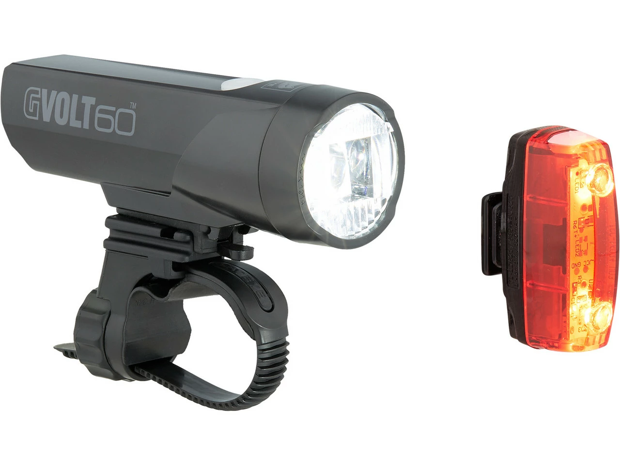 Lieferumfang:1 x Frontlicht CATEYE GVolt 601 x LED-Rücklicht CATEYE Rapid Micro G1 x Halterung CATEYE FlexTight H-34N1 x Sattelstützenhalterung CATEYE SP-14-R1 x Gummiband1 x Gummipolster für Halter1 x Micro-USB-Kabel